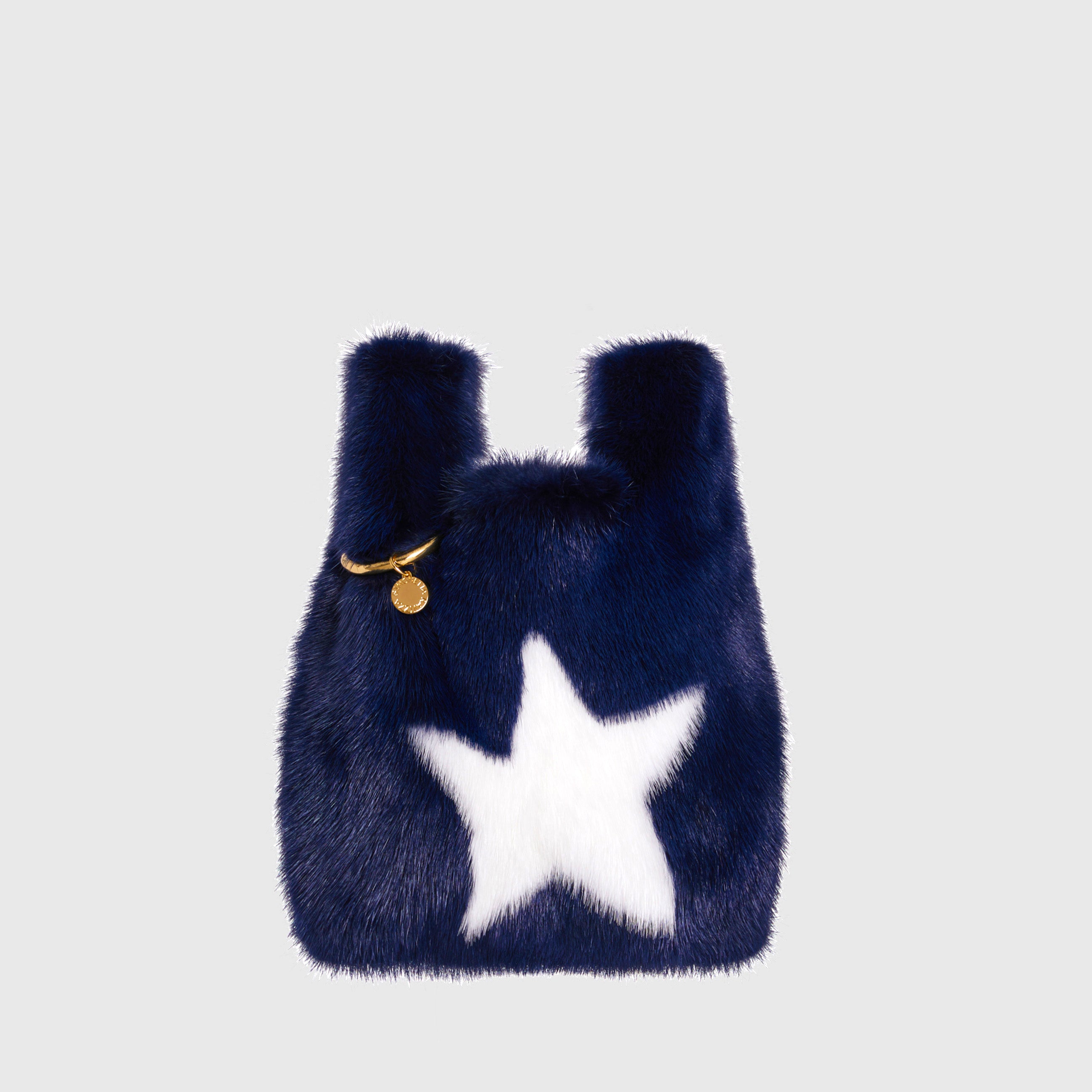 Mini handbag "Furrissima Baby", made of mink fur. Star-shaped inlay detail in optical white. Interior metal label applied to pocket with black enamel finish on gold background.