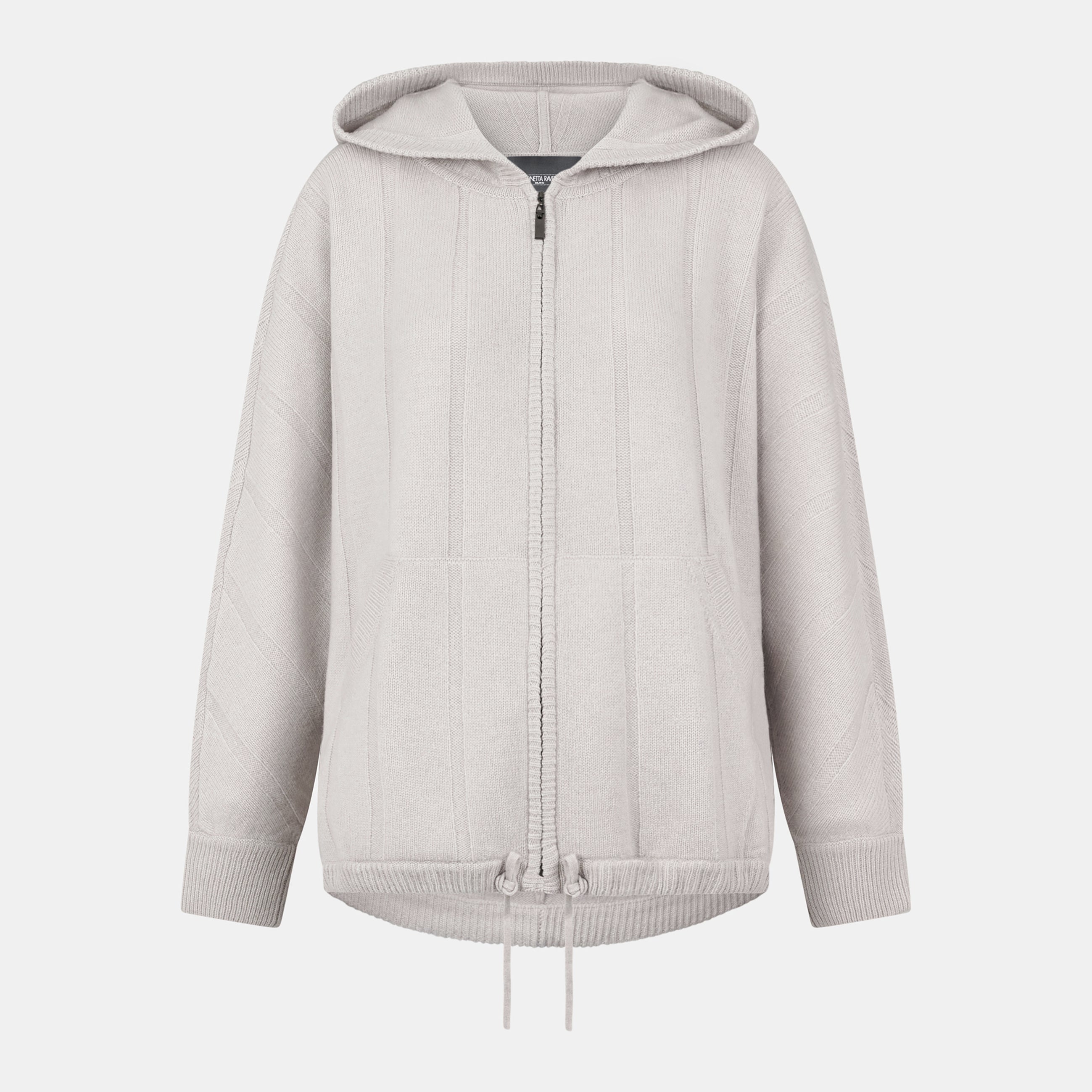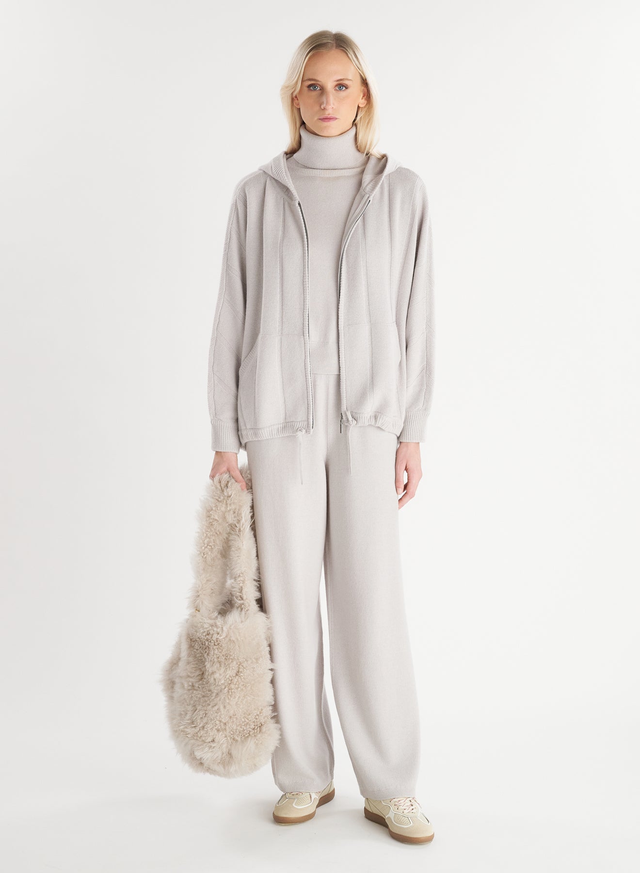 Ribbed cashmere sweatshirt with hood and zipper closure.