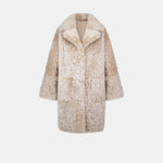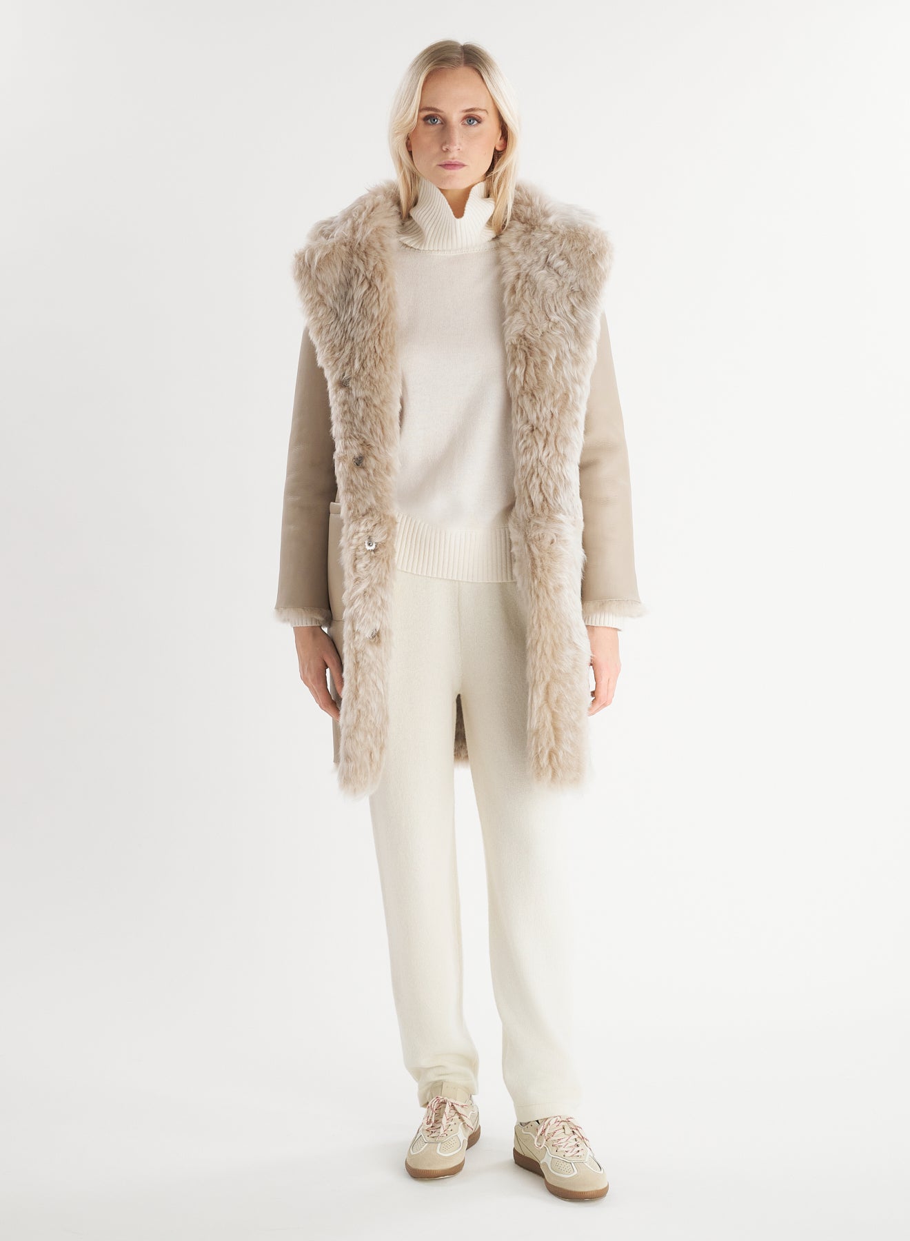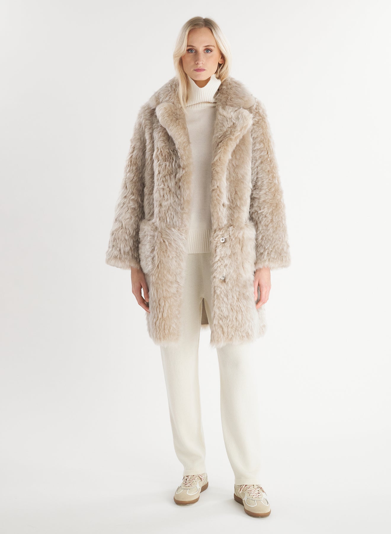Reversible COAT in oatmeal-colored ironed hippy shearling, zipper closure and front patch pockets.