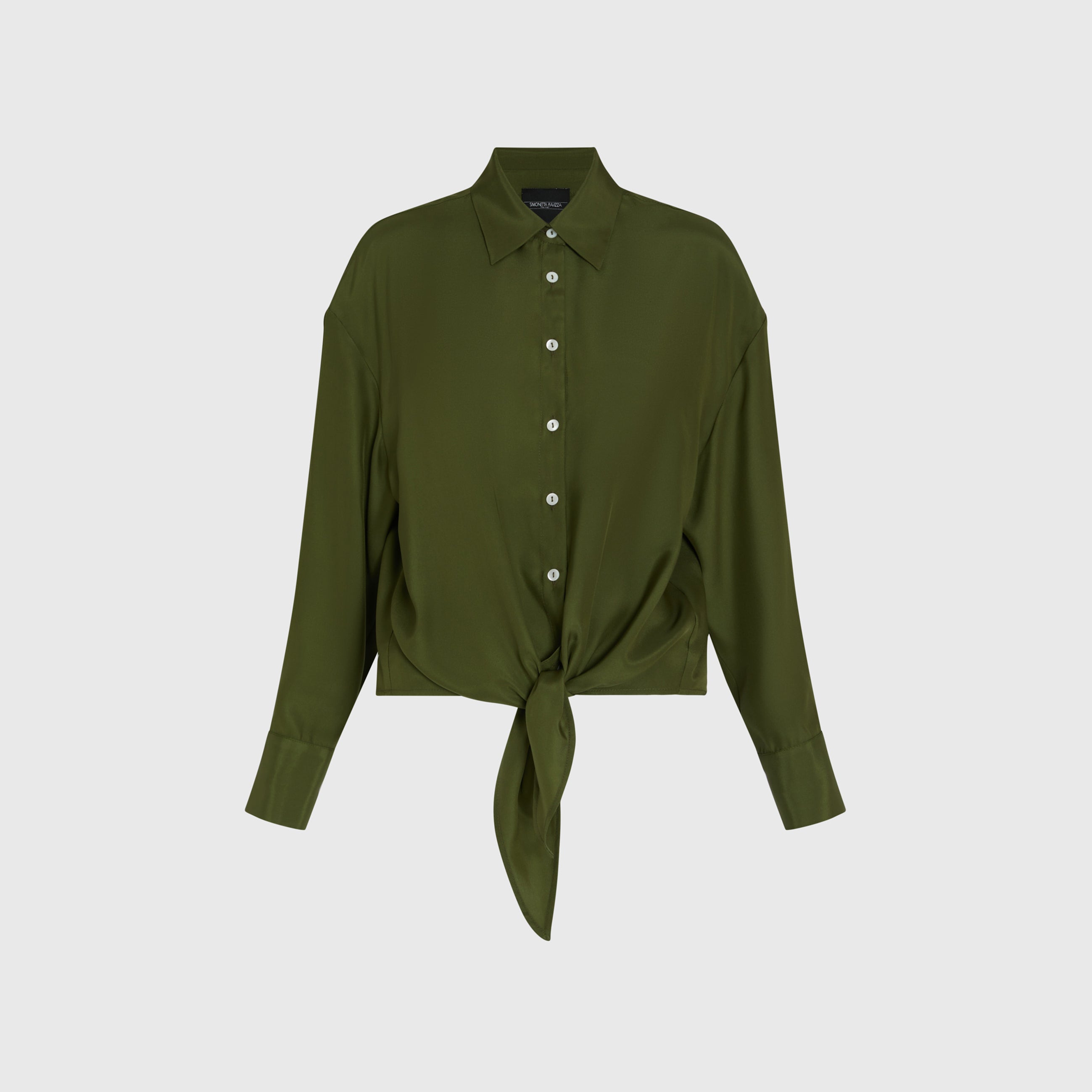 SHIRT with classic collar made of military green matte silk. Knot detail on the bottom.