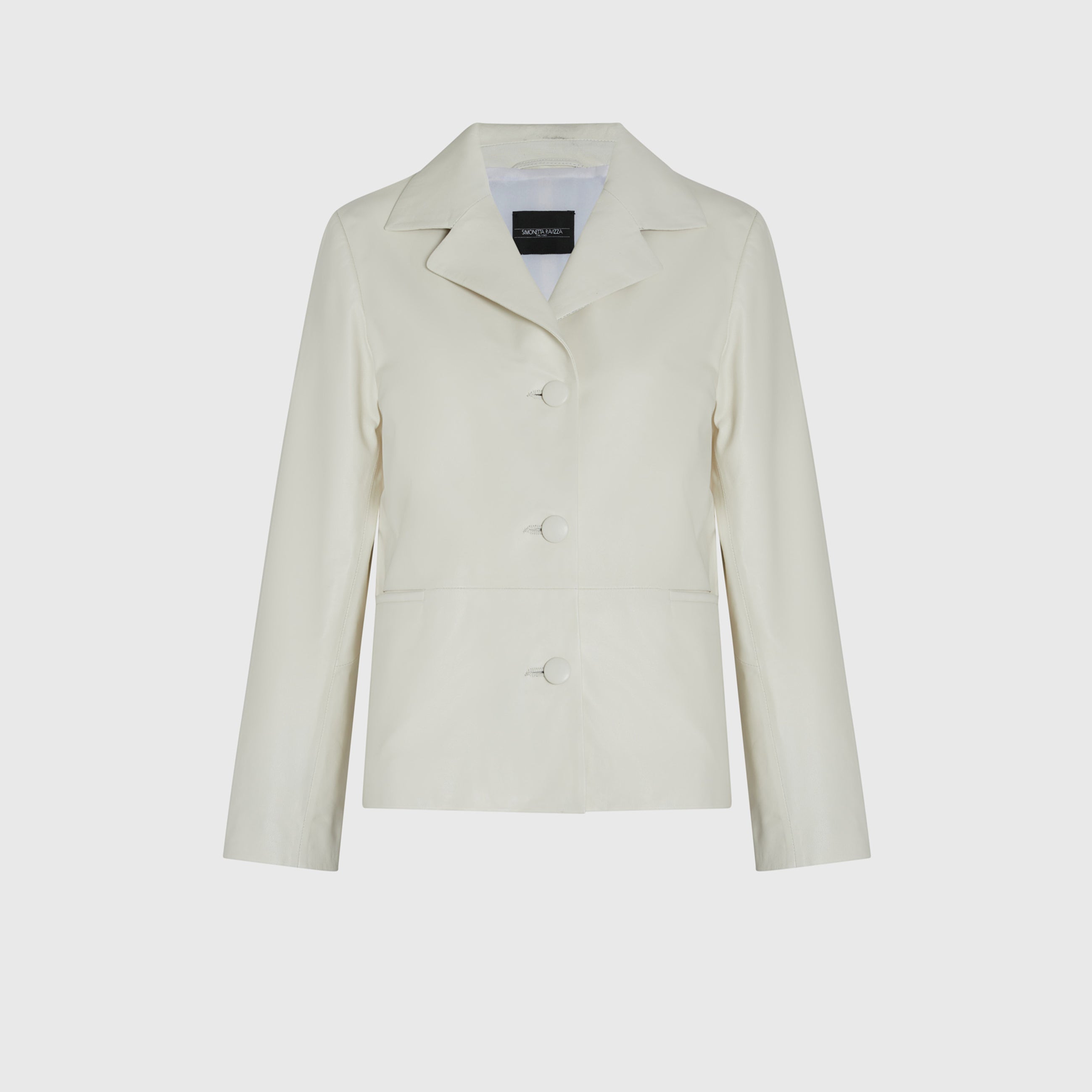 White leather single-breasted blazer jacket. Lined, button closure and patch pockets.