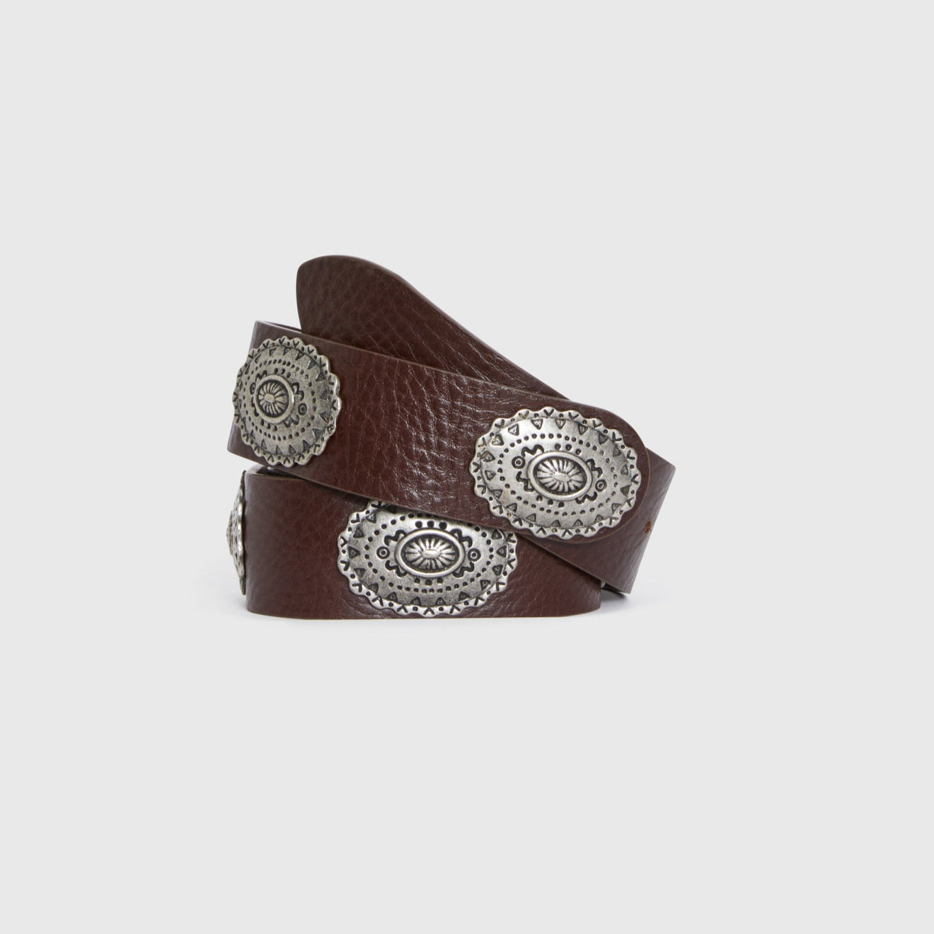 Dark brown leather belt with metal details.