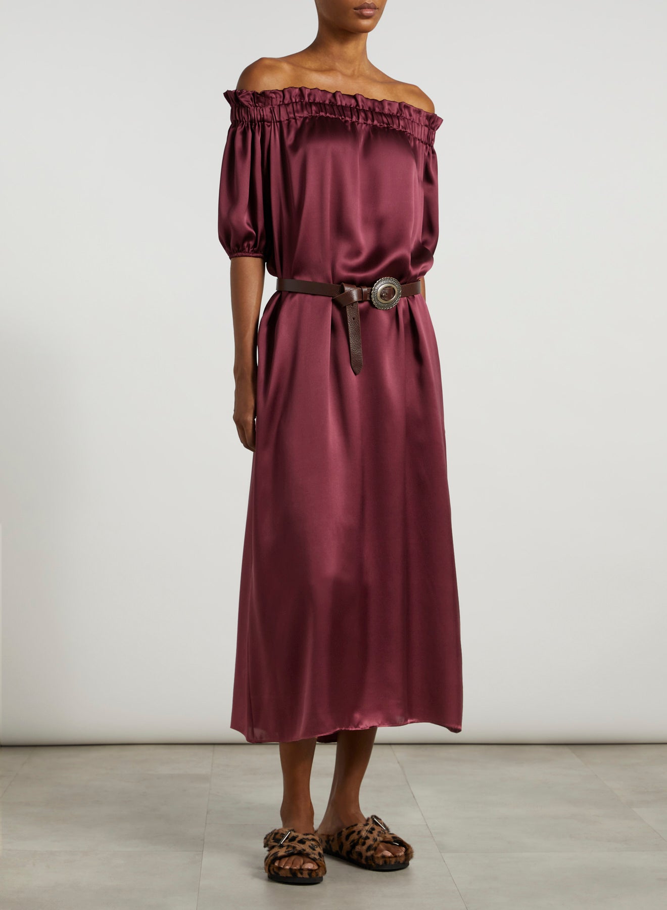 Maxi DRESS with bare shoulders made of silk. Elastic detail on neckline and sleeves.