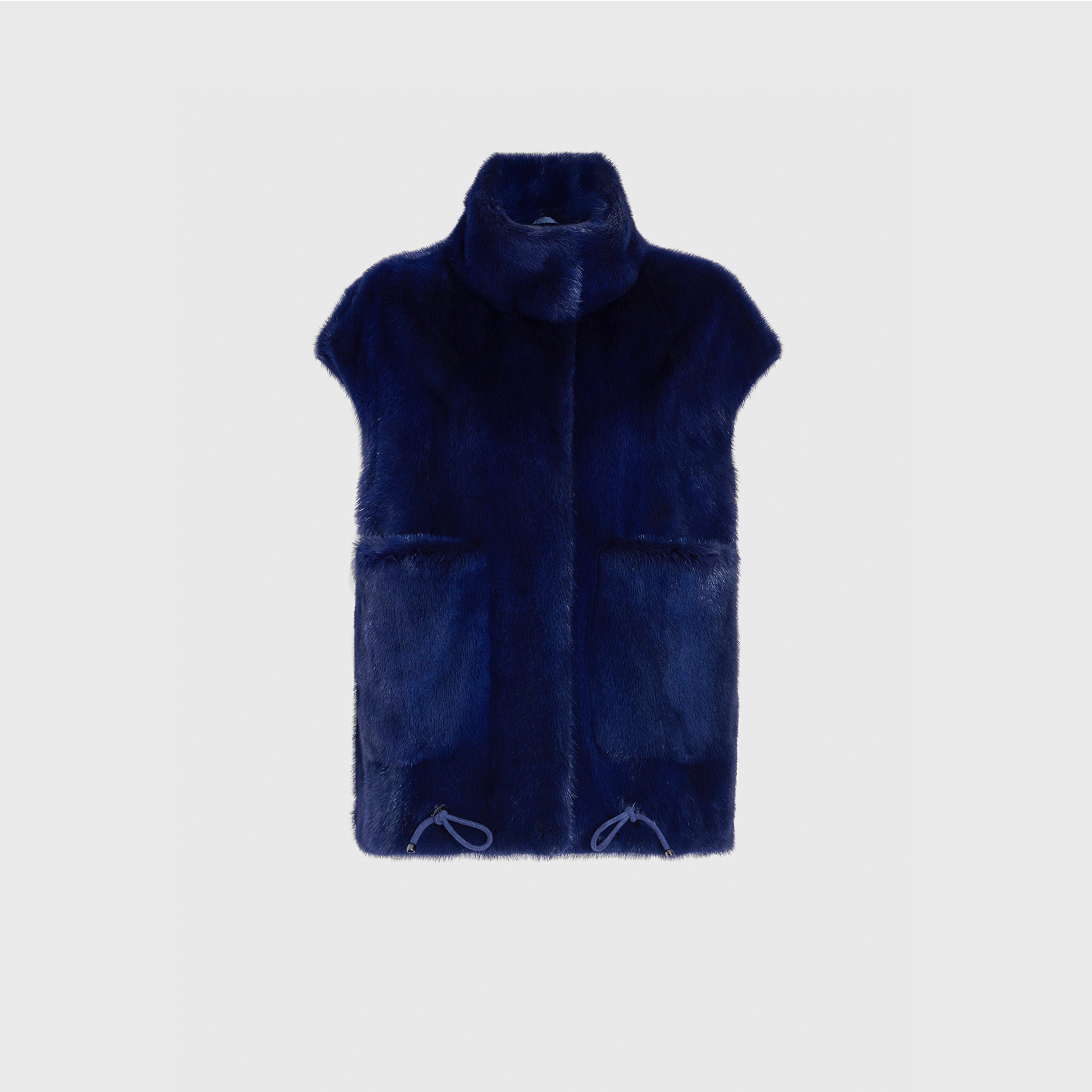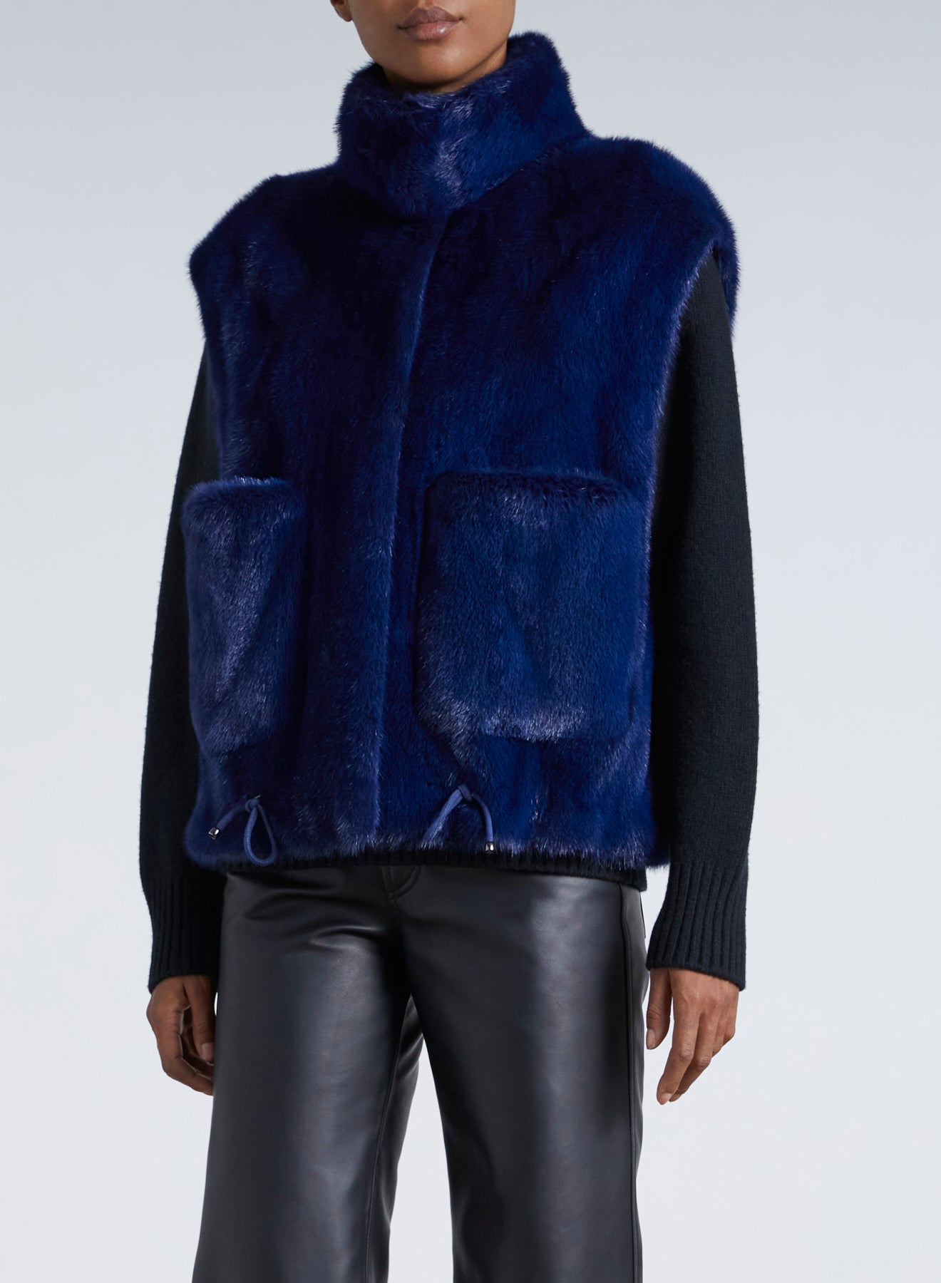 Gilet in pelliccia di visone blue marine con intarsio a forma di stella in bianco ottico sul dietro.