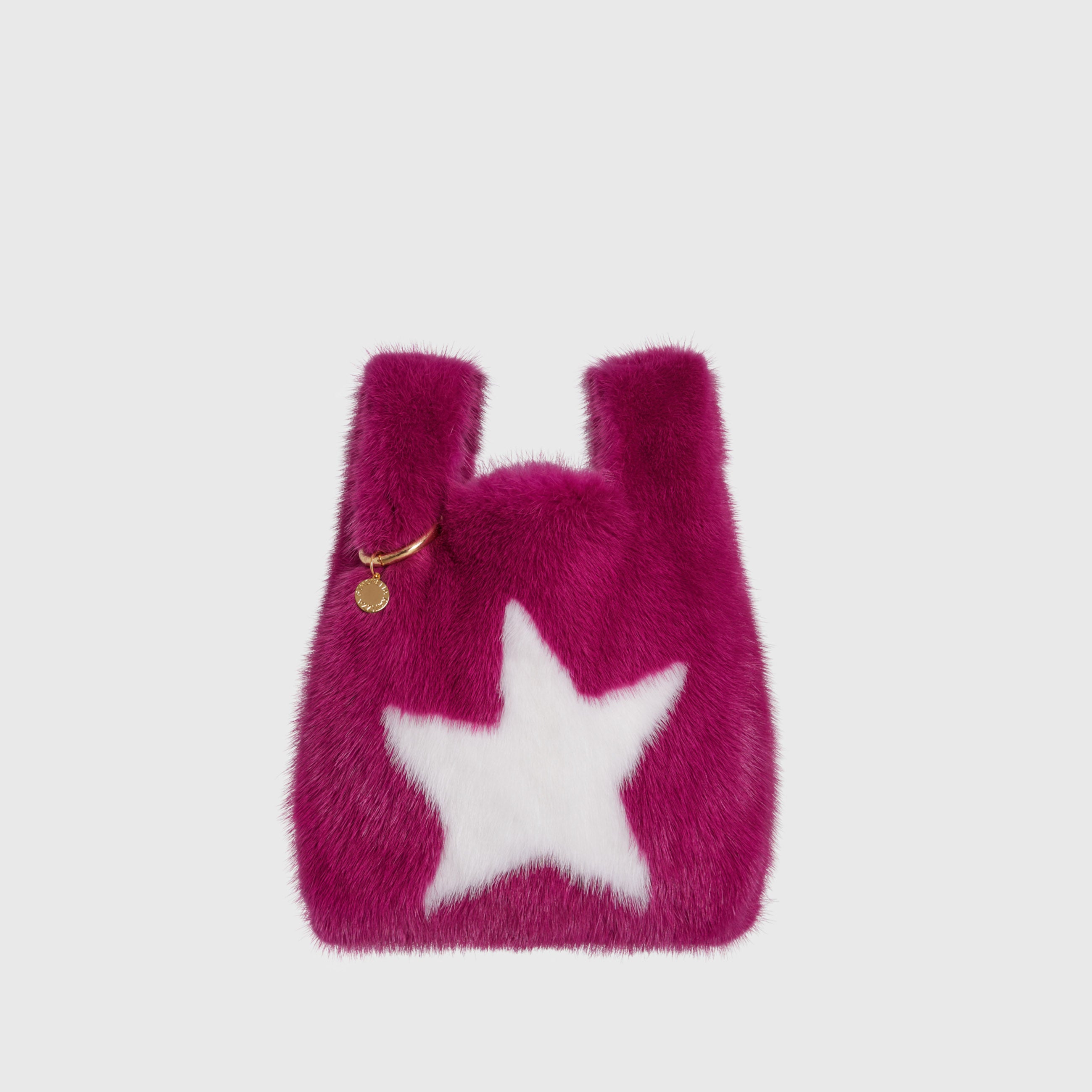 Mini borsa a mano "Furrissima Baby", realizzata in pelliccia di visone. Dettaglio intarsio a forma di stella in bianco ottico. Etichetta metallica interna applicata su tasca con finitura smaltata nera su fondo oro.