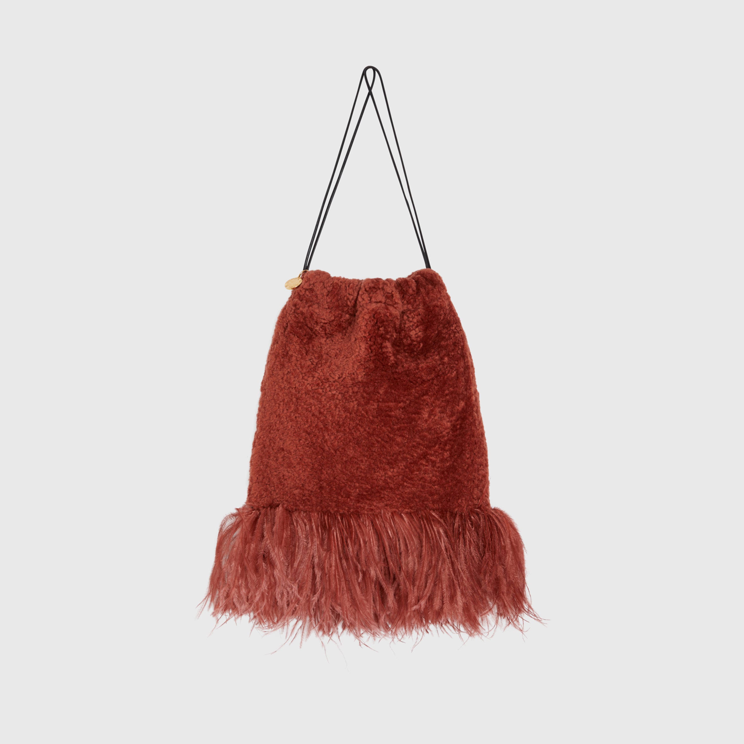 Borsa a sacchetto "Furrissima", realizzata in shearling tom curly con dettaglio piume. Accessori metallici con finitura dorata.