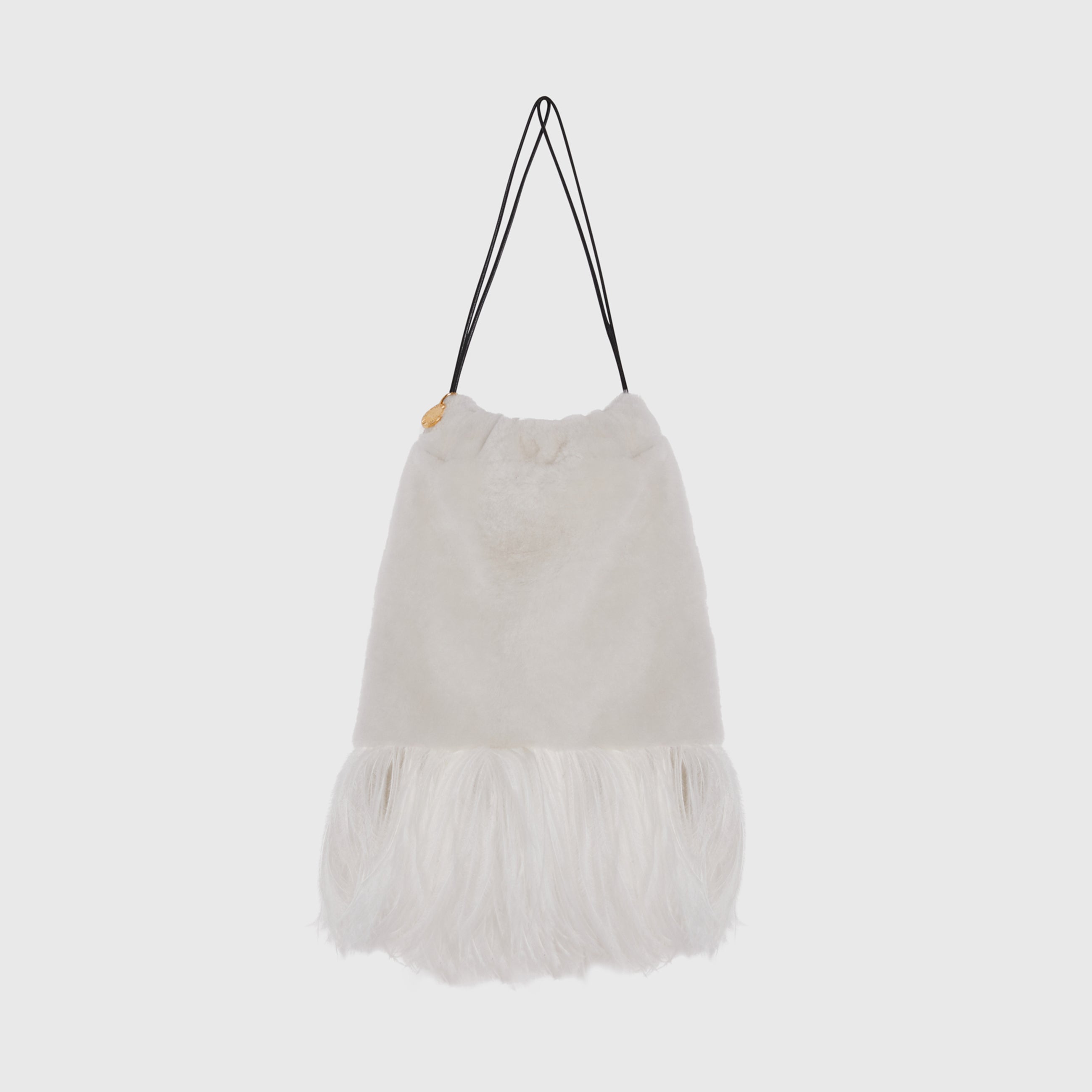 Borsa a sacchetto "Furrissima", realizzata in shearling astrale con dettaglio piume. Accessori metallici con finitura dorata.