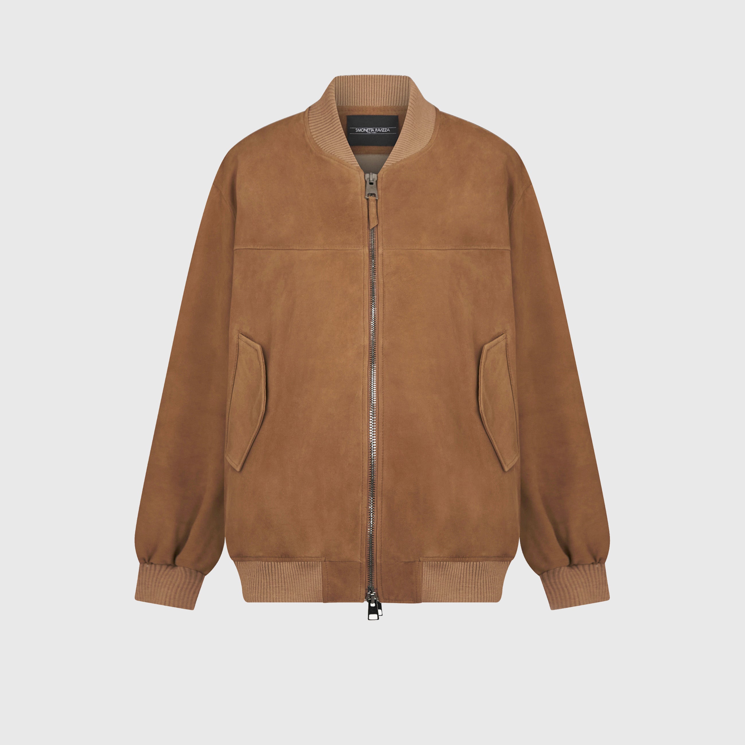 Bomber over realizzato in suede color noisette, collo e polsini in maglia. Dettaglio tasche con pattine laterali e chiusura con zip.