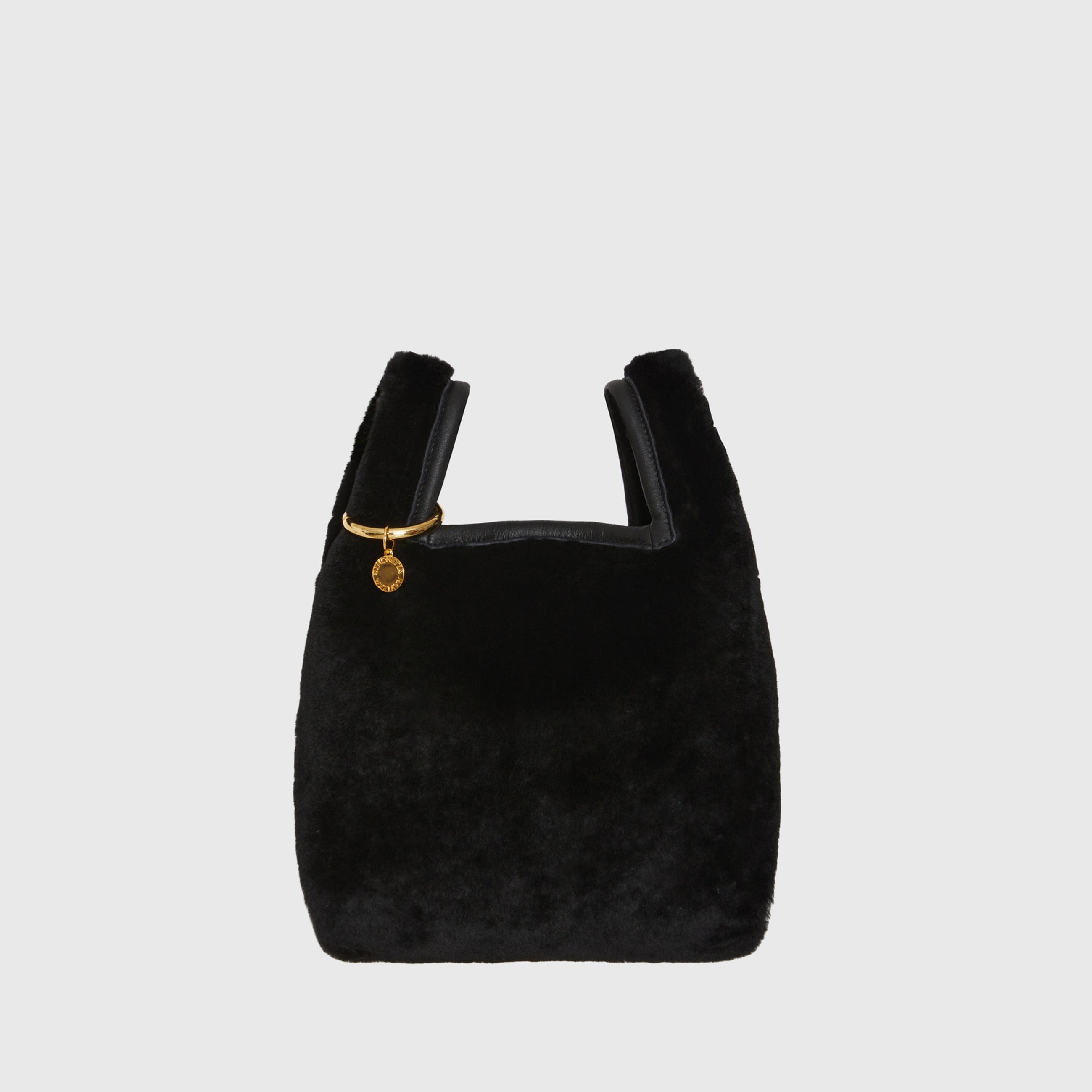 Mini borsa a mano "Furrissima", realizzata in shearling nero astrale con interno in cuoio in tinta. Etichetta metallica interna applicata su tasca con finitura smaltata nera su fondo oro. Accessori metallici con finitura dorata.