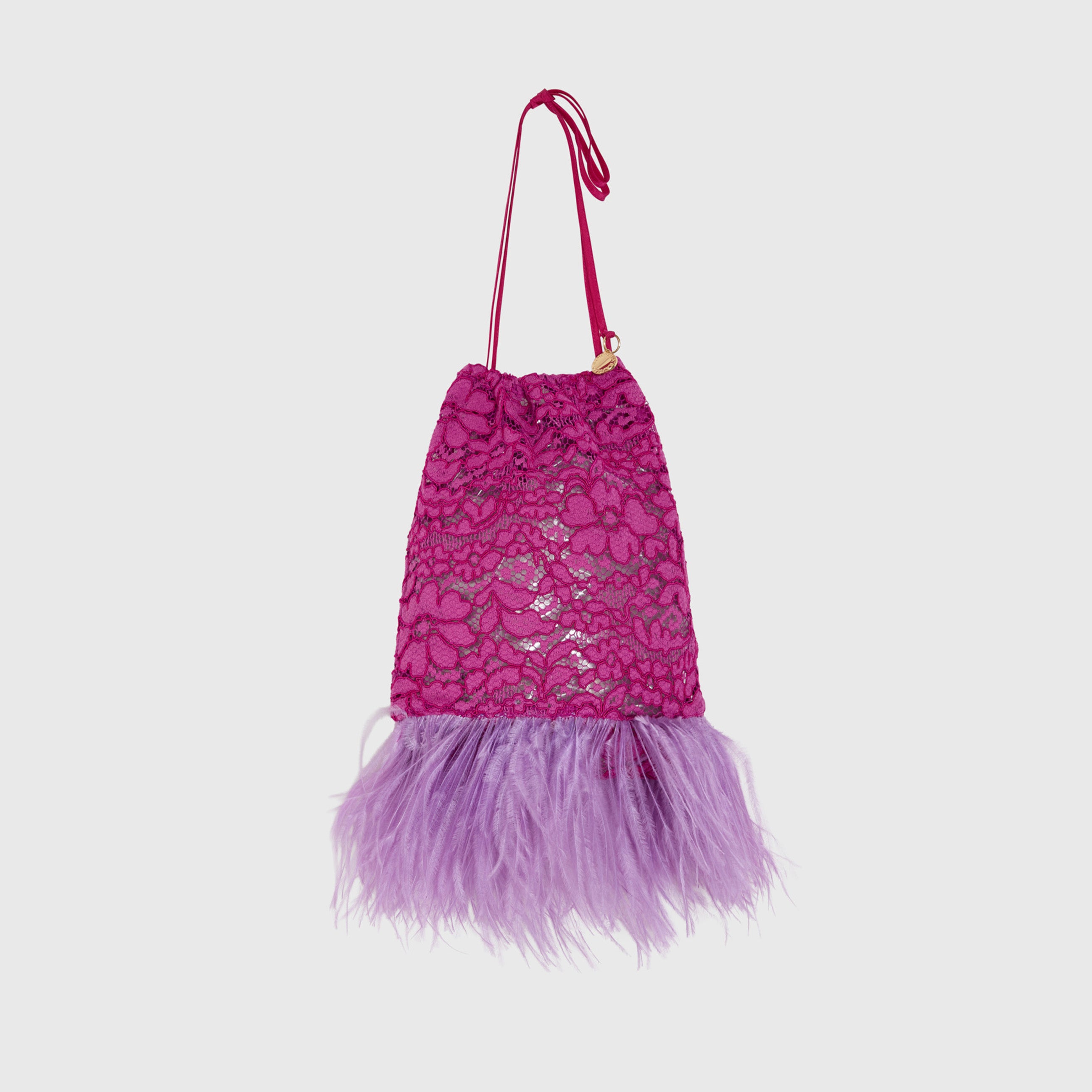 Borsa a sacchetto "Furrissima", realizzata in pizzo. Accessori metallici con finitura dorata. Dettagli di piume.