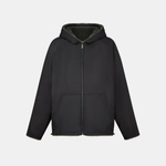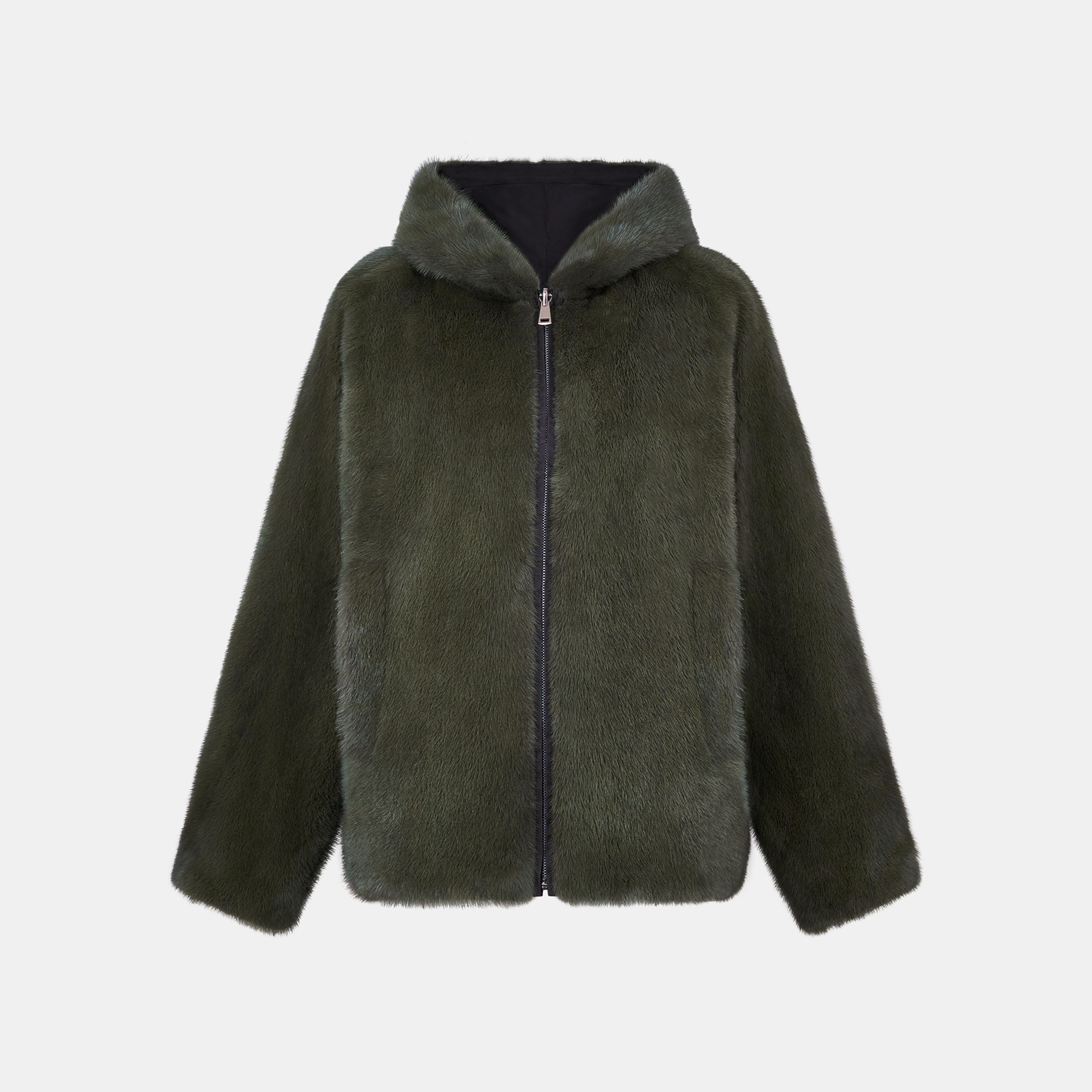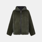 Giacca reversibile con cappuccio, realizzata in visone con interno in nylon. Chiusura con zip.