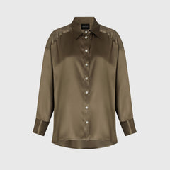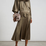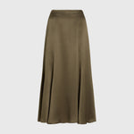Gonna midi realizzata in seta color fango. Vita alta e linea svasata.