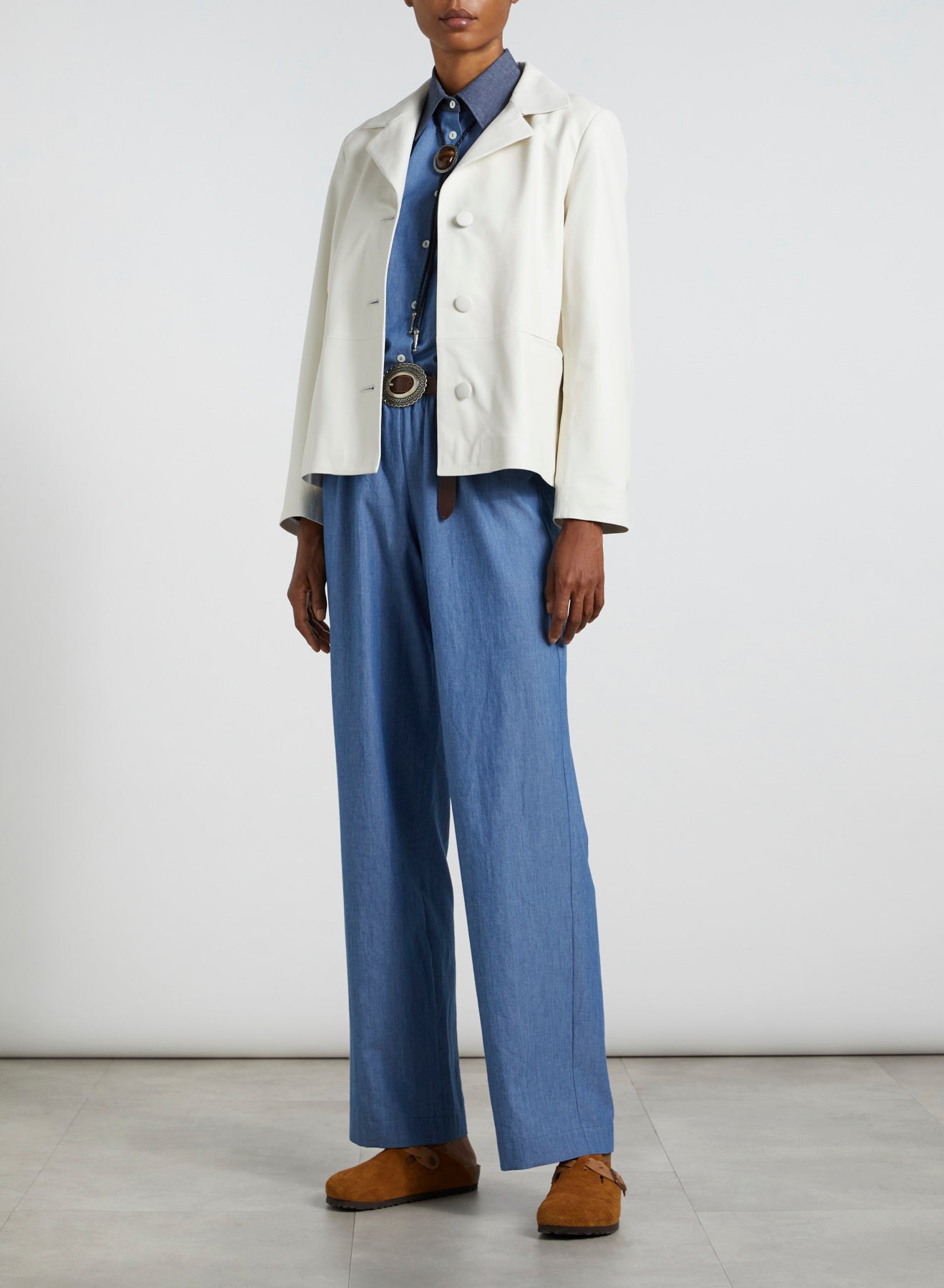 Giacca blazer monopetto in pelle bianca. Foderata, chiusura con bottoni e tasche applicate.
