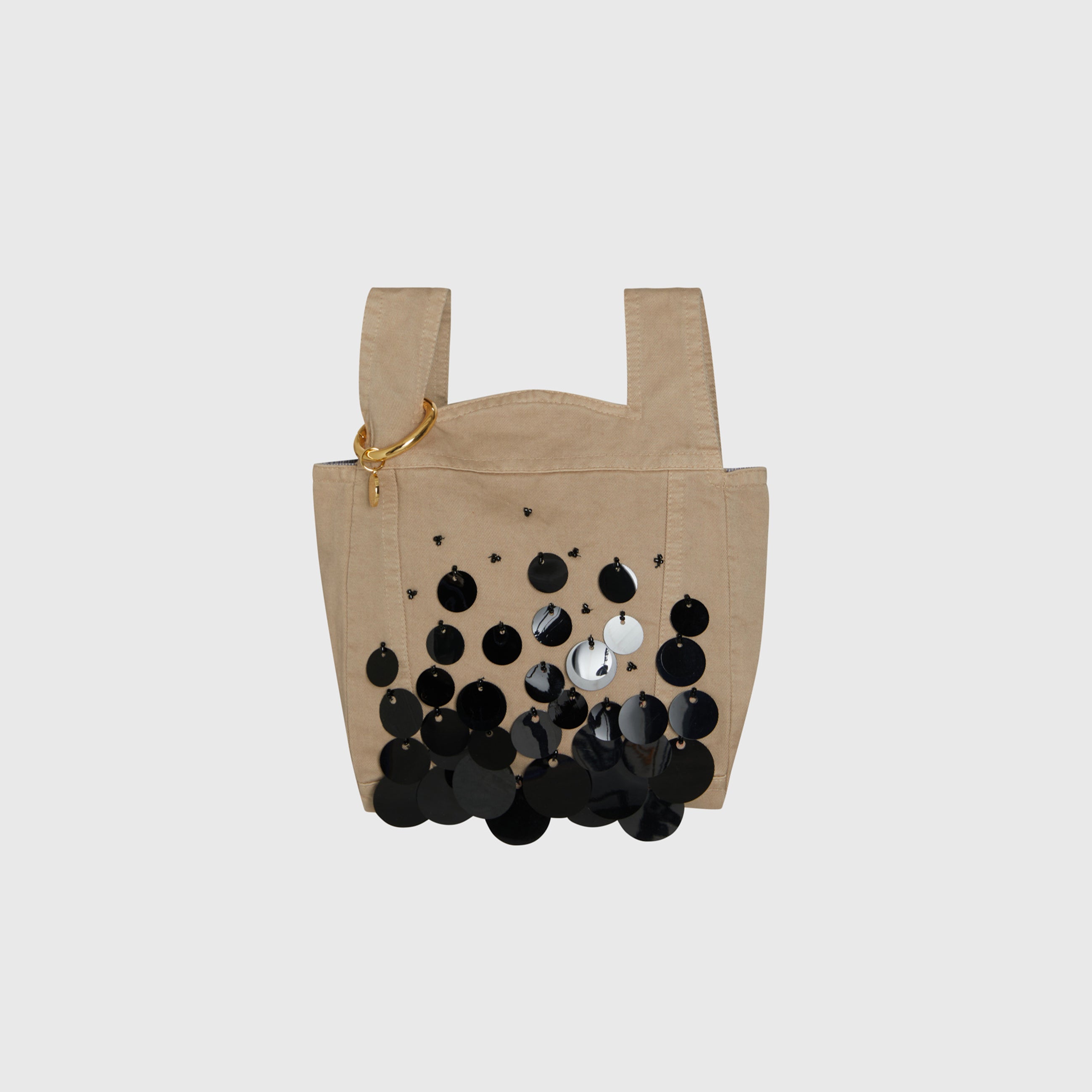 Mini borsa a mano "Furrissima baby", realizzata in cotone cachi e paillettes ricamate. Etichetta metallica interna con finitura smaltata nera su fondo oro. Accessori metallici con finitura dorata.