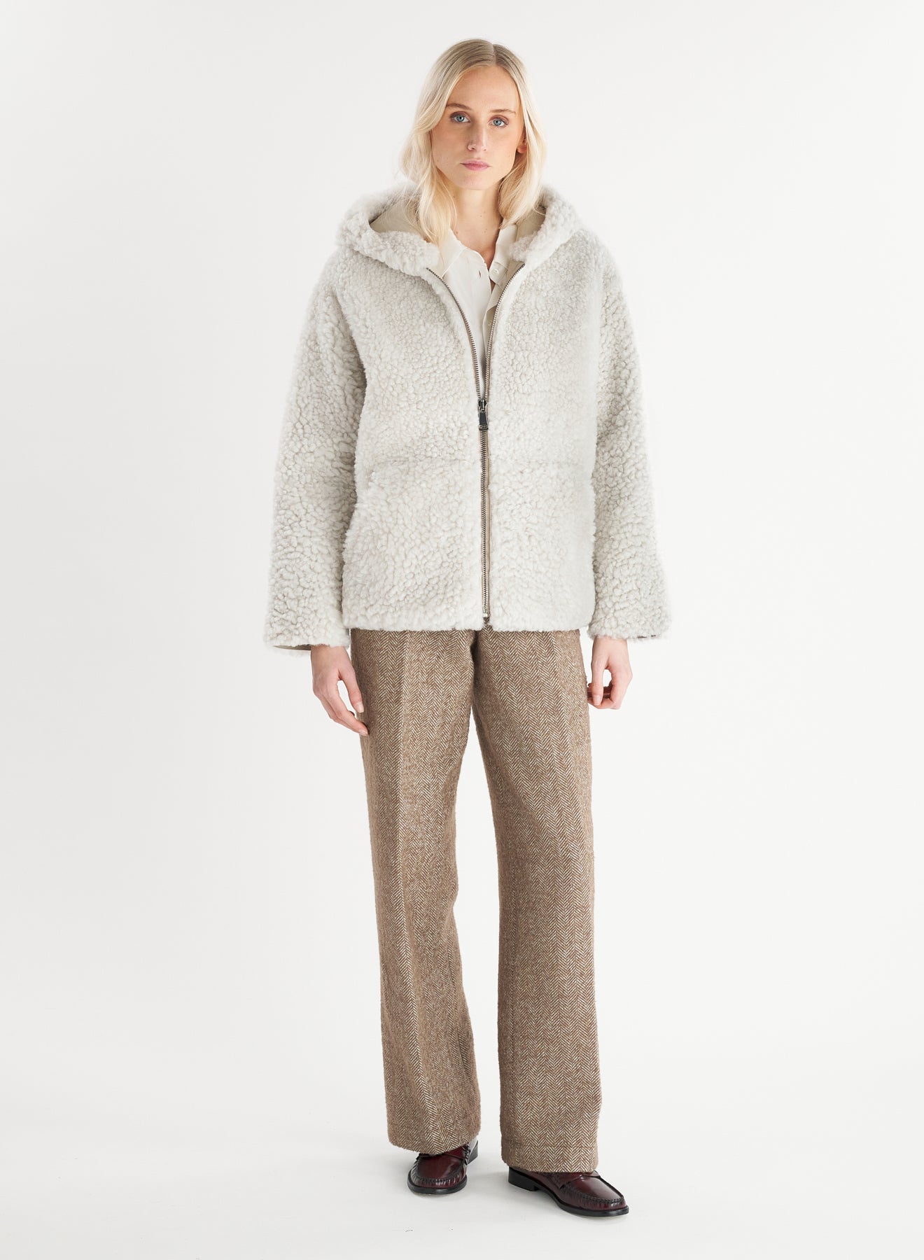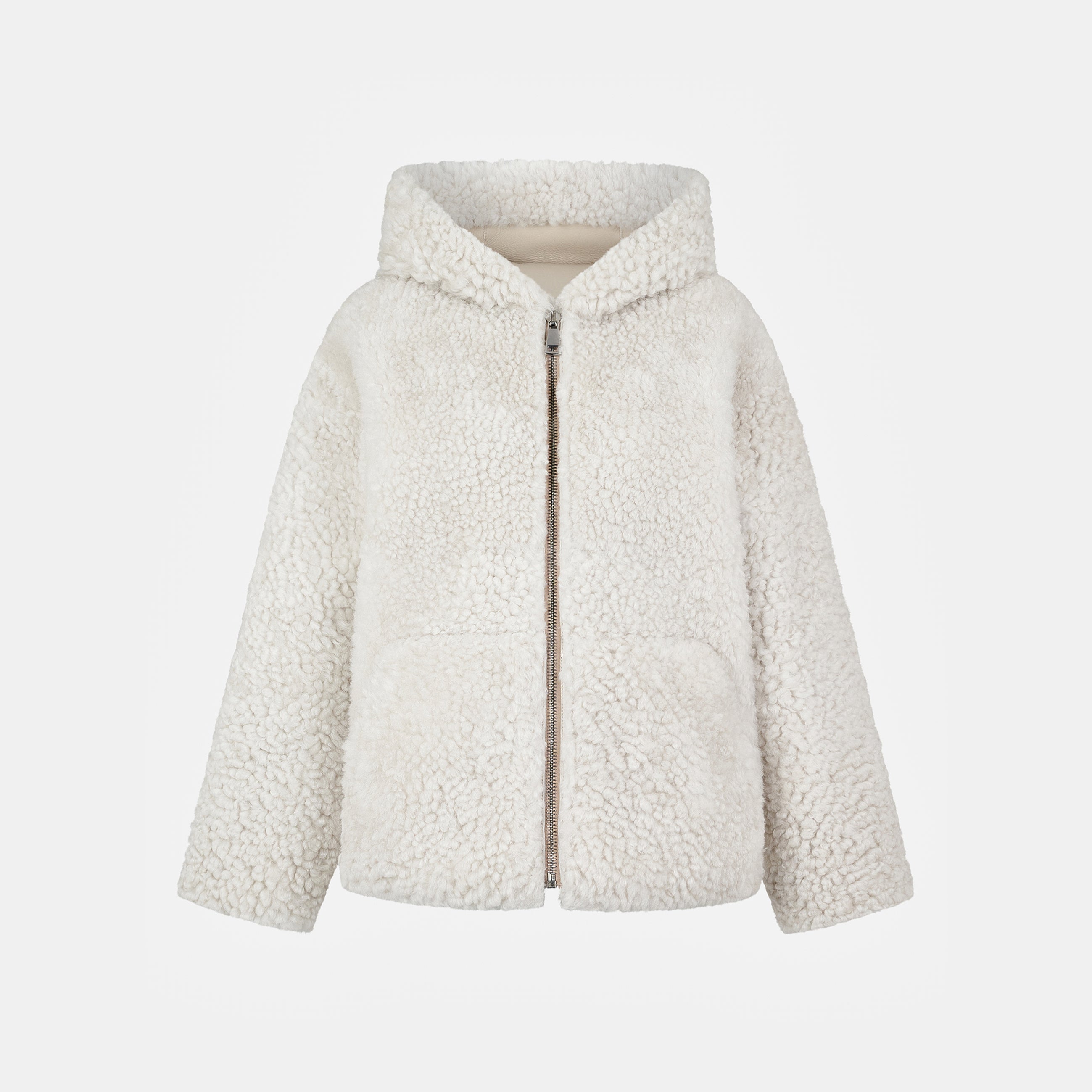 Jacket made from pearl shearling, with hood and zip closure.